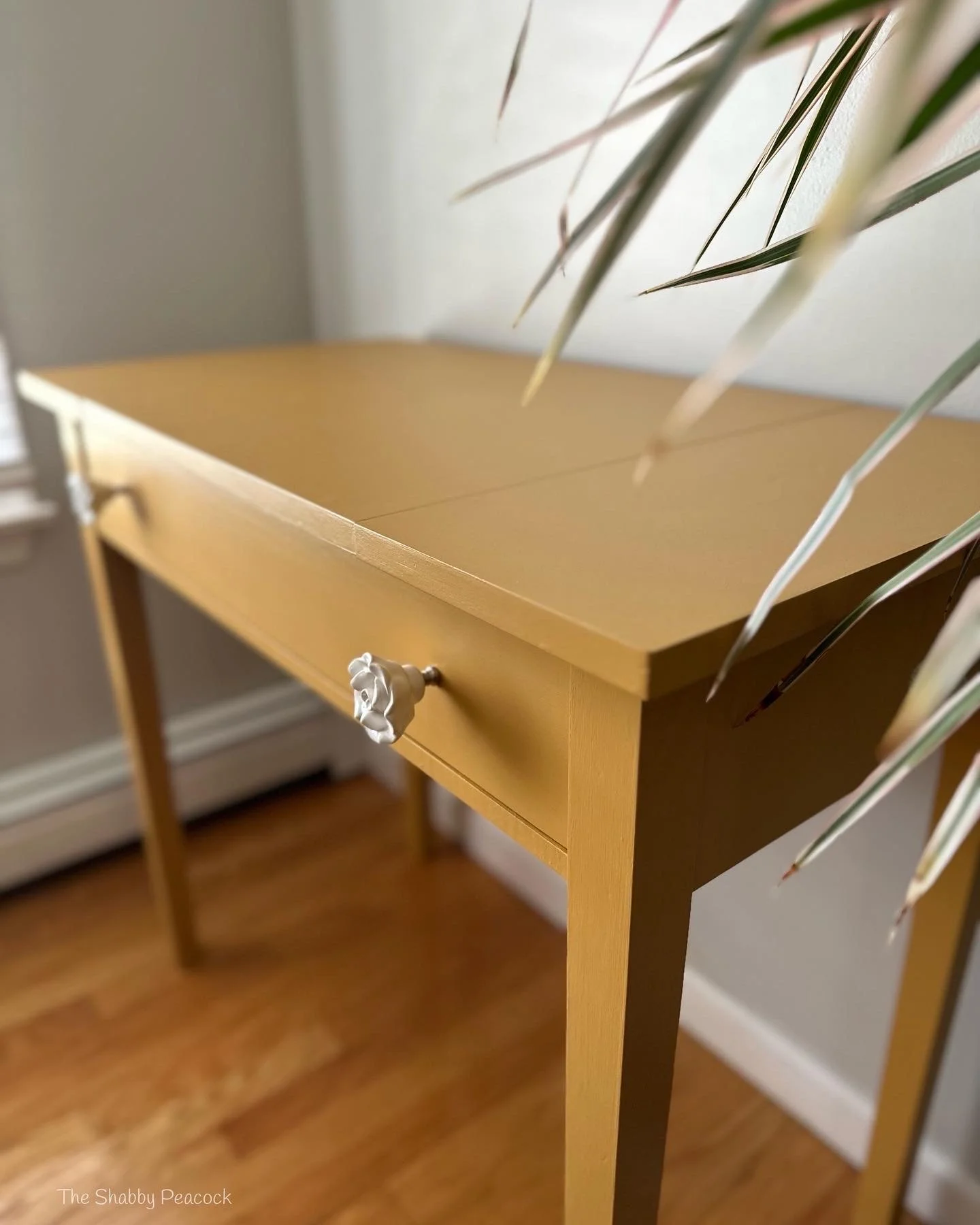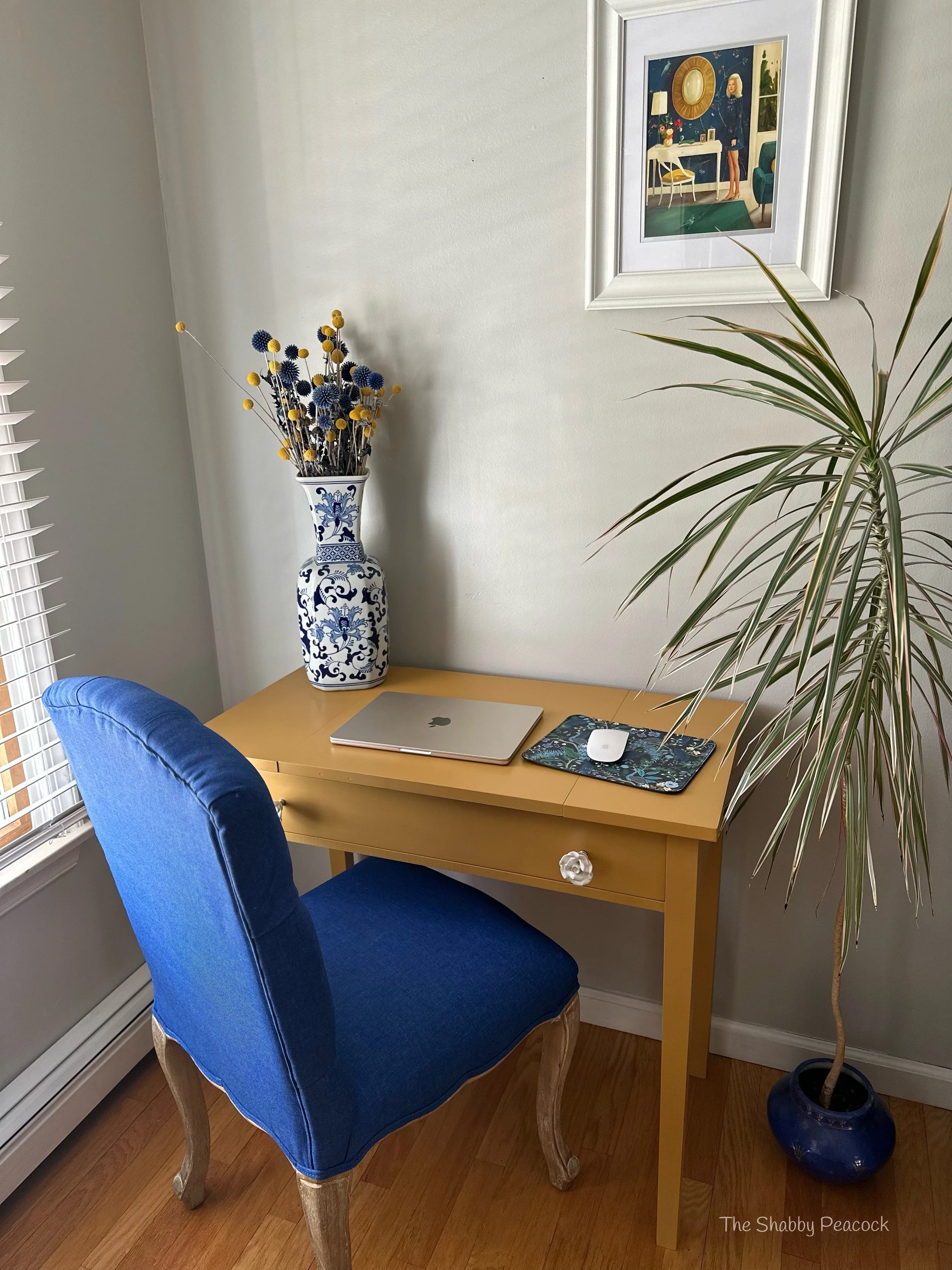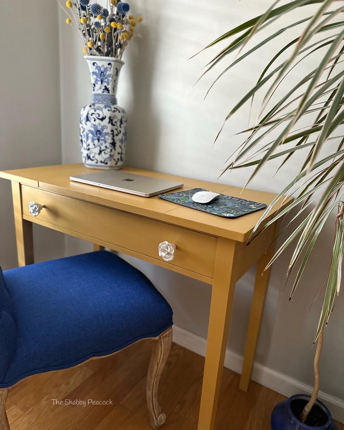 Meet Tatum! This piece is so versatile! She can be utilized as a desk or writing table, a vanity, or in an entryway or hallway to hide away keys and other essentials. This piece has been painted with Annie Sloan satin paint in Carnaby Yellow and has been given two applications of water based topcoat for added protection. Tatum is a timeless vintage piece with a cottage core vibe.