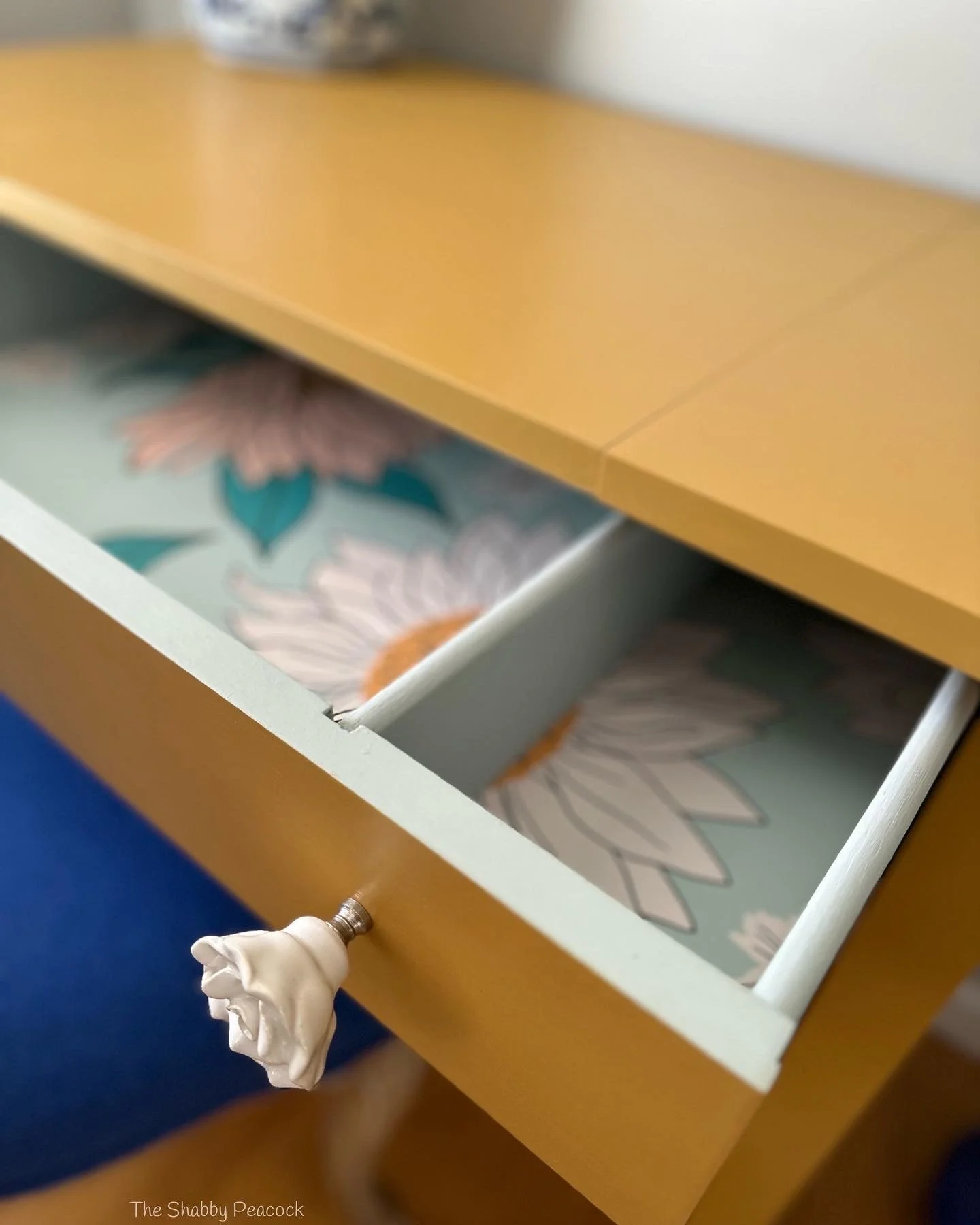 This piece came to me as a dresser, but after her glow-up, she’s giving major buffet vibes! Drucinda has great storage and could be utilized in a variety of ways. All of her drawers glide easily, are dovetailed, and are lined with a peel and stick wallpaper in a geometric bird print.