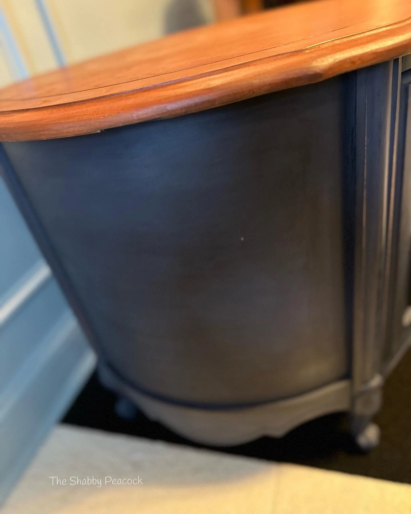 The legs of this piece drew me to it; I knew I had to highlight them to show them off! The legs were sanded down to bare wood and stained using Dixie Belle Voodoo stain in Au Natural. The rest of the piece is painted with Dixie Belle Silk in Midnight Green. I used parts of a Re-Design with Prima floral transfer to infuse a bit more personality into the piece.